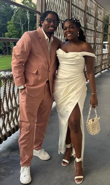 A bride and groom dancing outdoors on a grassy area during sunset, with trees in the background. The bride is in a white wedding dress, and the groom is in a blue suit.