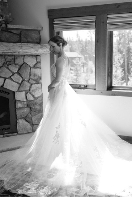 A bride in a white wedding dress with lace and floral details, smiling and standing by a window with curtains.