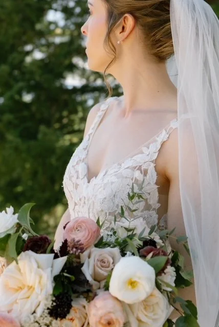 Bride in a strapless white wedding dress holding a bouquet of white flowers and greenery, standing outdoors with blurred flowers and greenery in the background.
